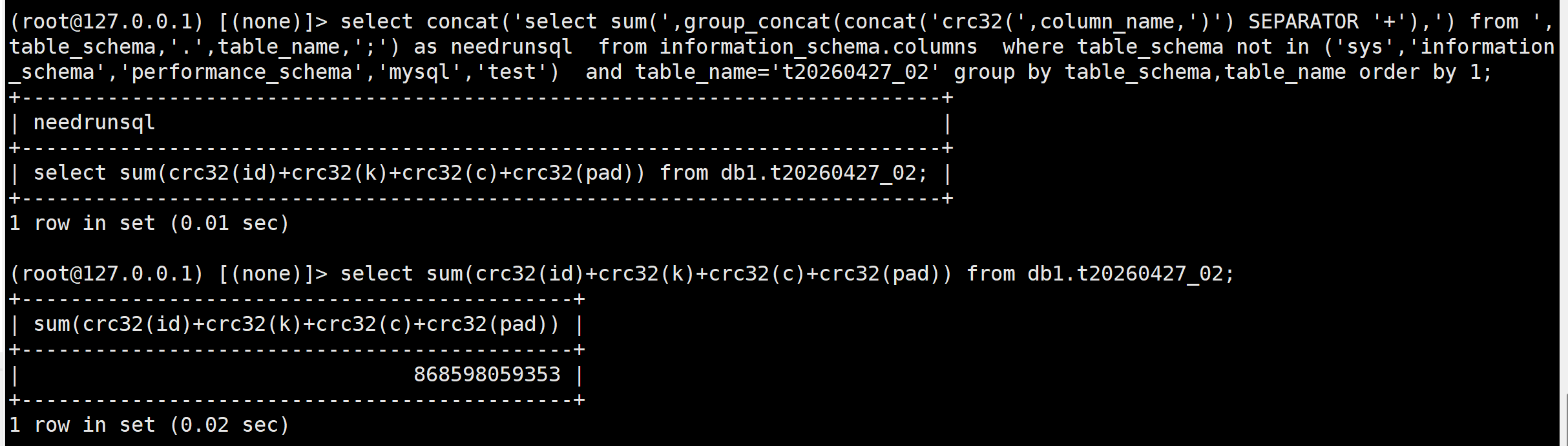 select concat('select sum(',group_concat(concat('crc32(',column_name,')') SEPARATOR '+'),') from ',table_schema,'.',table_name,';') as needrunsql from information_schema.columns where table_schema not in ('sys','information_schema','performance_schema','mysql','test') and table_name='t20260427_02' group by table_schema,table_name order by 1;