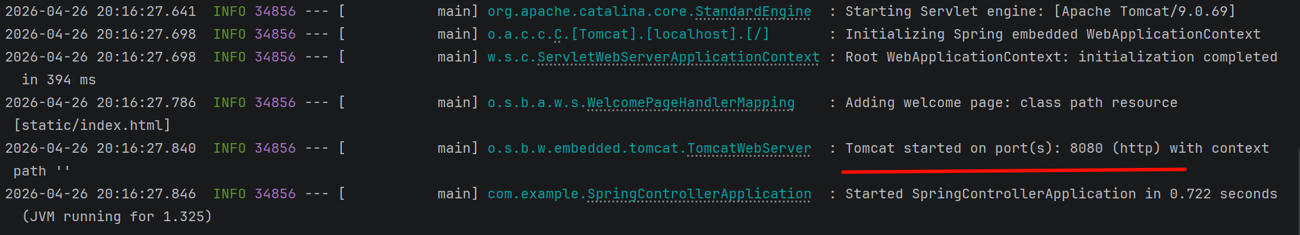 }直接运行 SpringControllerApplication 文件就能启动 Web 服务,不用再自己配置 Tomcat。Spring Boot 内嵌了 Tomcat,直接运行主类它自己就把 Tomcat 启动了,这也是 Spring Boot 和传统 Spring MVC 最大的区别之一——传统 Spring MVC 需要你自己装 Tomcat、打 war 包部署,Spring Boot 直接 java -jar 就能跑。