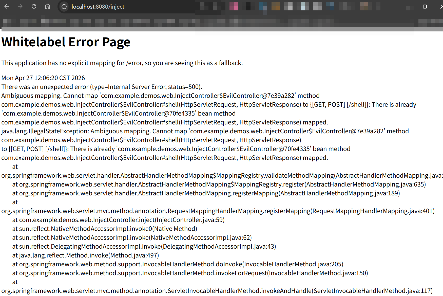 注意:如果两个 Controller 注册了同一个路径,Spring 启动时会直接报错: Caused by: java.lang.IllegalStateException: Ambiguous mapping. Cannot map 'xxxController' method Spring 不允许同一路径重复注册,启动就失败了。这个特性在打内存马时也要注意,注入前要确保路径没被占用。