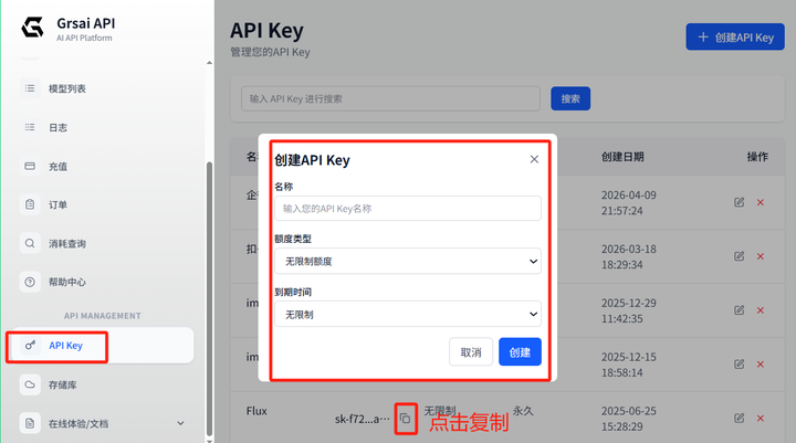 获取方法:进入Grsai APi(Grsai.ai ai域名国内可访问,com需要魔法) 创建Apikey并复制,https://grsai.ai/zh/dashboard/api-keys