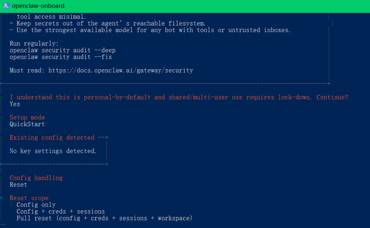 安装成功后会直接提醒你进行初始化配置,如果你因为需要修复其它问题或者选择错误导致没有进入初始化配置可以使用这个指令进入,初始化配置里可以配置api和通讯工具。