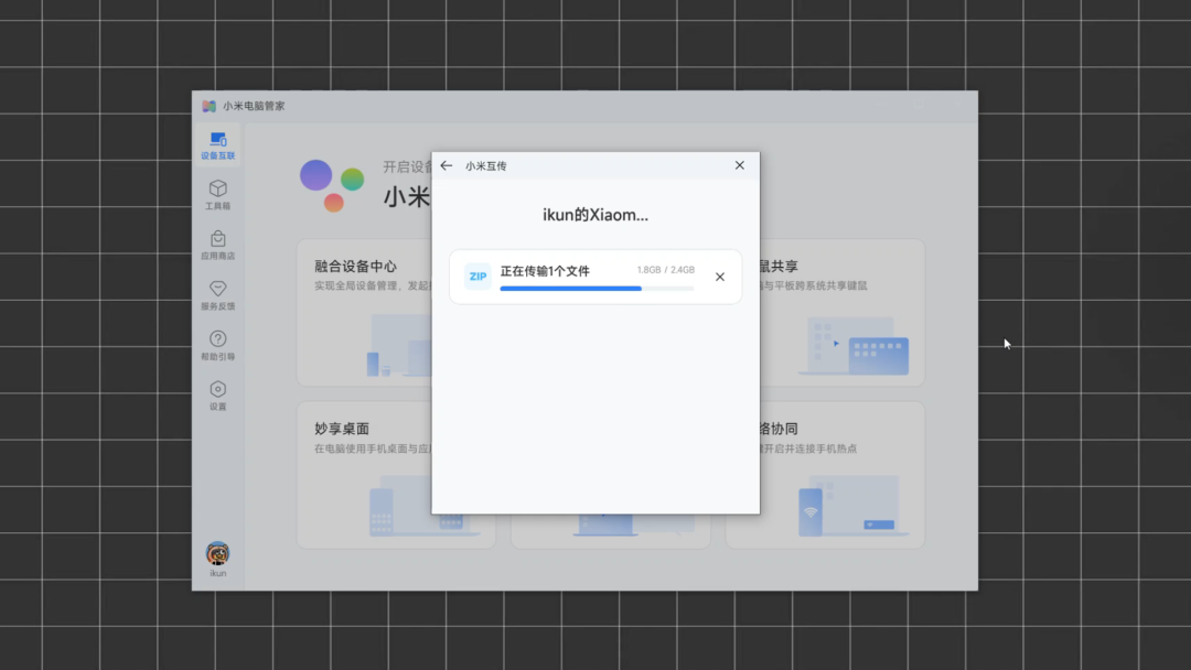 这个功能简直是大文件传输的救星。实测传输一个 2.4G 的文件只需要十几秒!比微信、QQ快太多了。