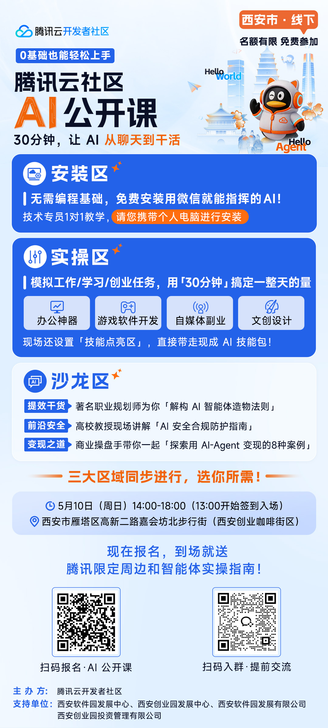 5 月 10 日(周日),腾讯云开发者社区「AI 公开课」将落地西安。本次活动由腾讯云开发者社区主办,联合多方生态力量共同发起,聚焦一个最朴素、也最真实的问题——