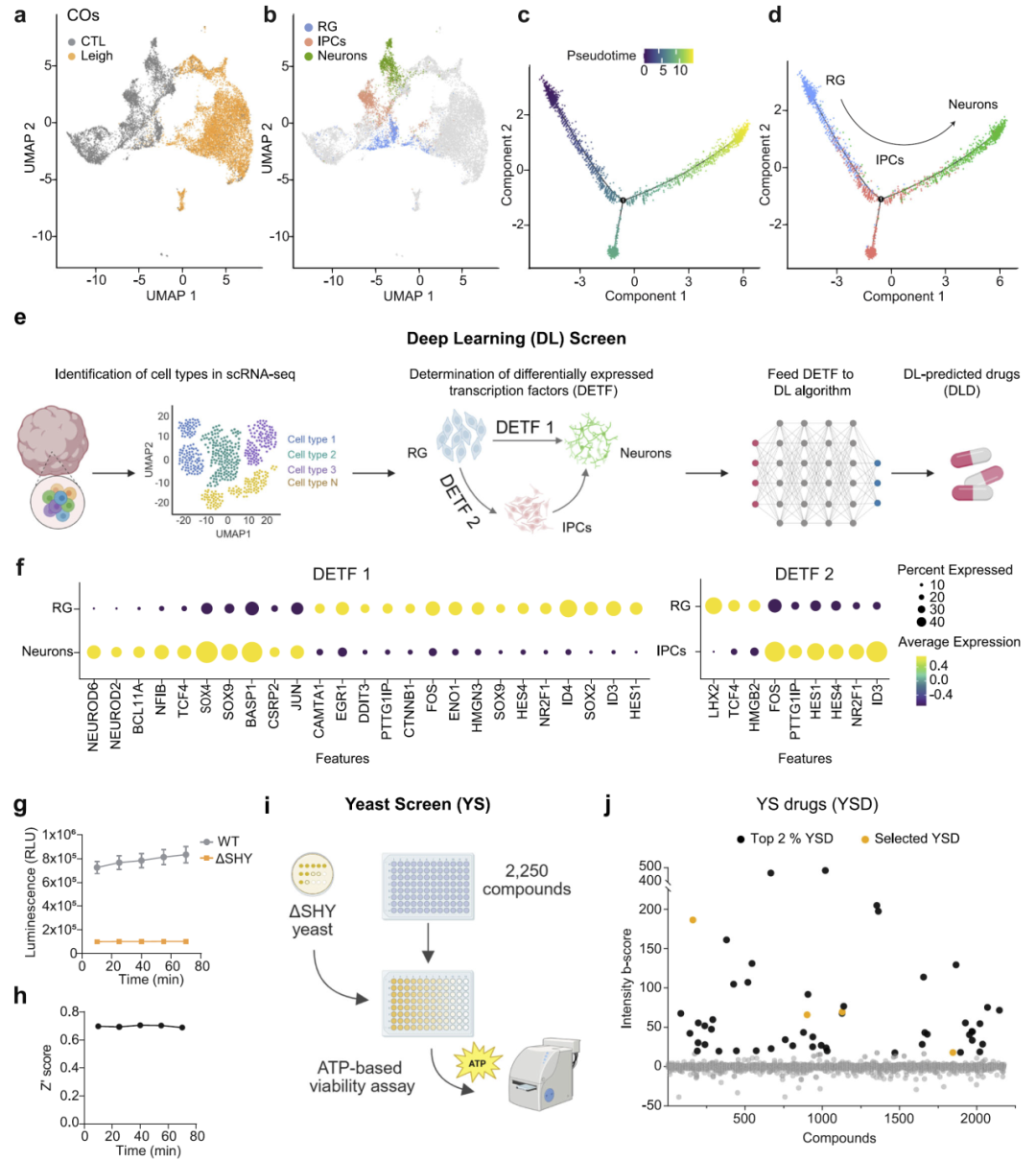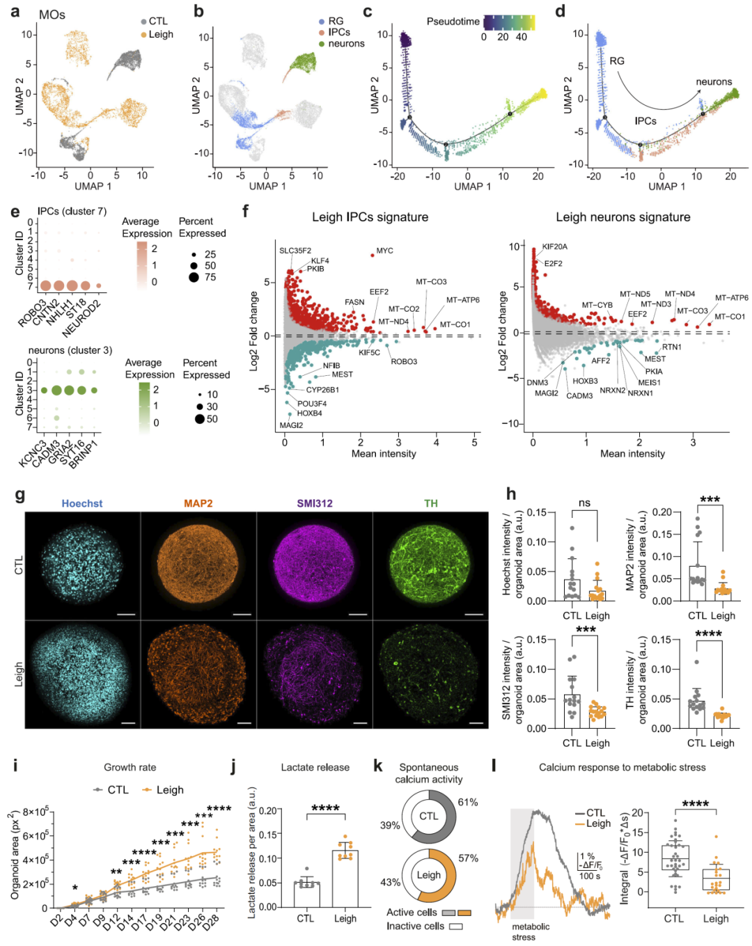 单细胞分析表明,Leigh脑类器官中主要缺乏中间祖细胞和成熟神经元,而径向胶质细胞仍然存在,这提示神经分化过程受阻。伪时间分析进一步验证了神经发育路径从祖细胞向神经元的演化方向。