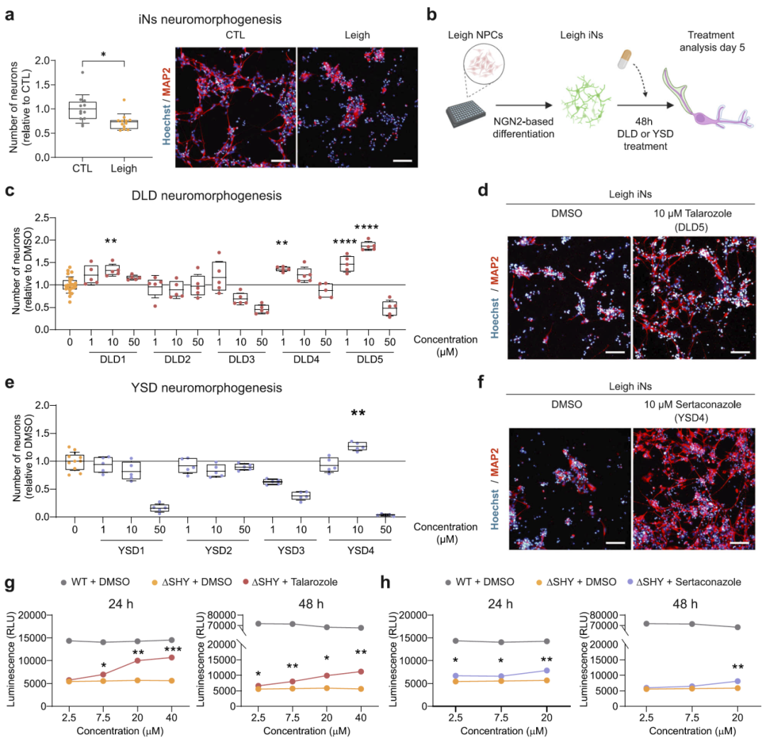 在体外神经分化实验中,Leigh来源细胞生成神经元的能力显著降低。经过药物处理后,他拉罗唑和舍他康唑均能显著提高神经元数量,并改善神经突起结构。