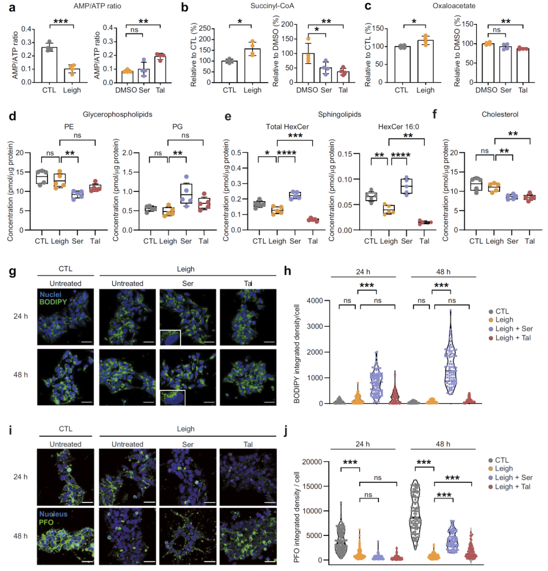 代谢组学分析显示,Leigh细胞中能量代谢严重受损,而他拉罗唑能够恢复AMP/ATP比值并改善三羧酸循环代谢。