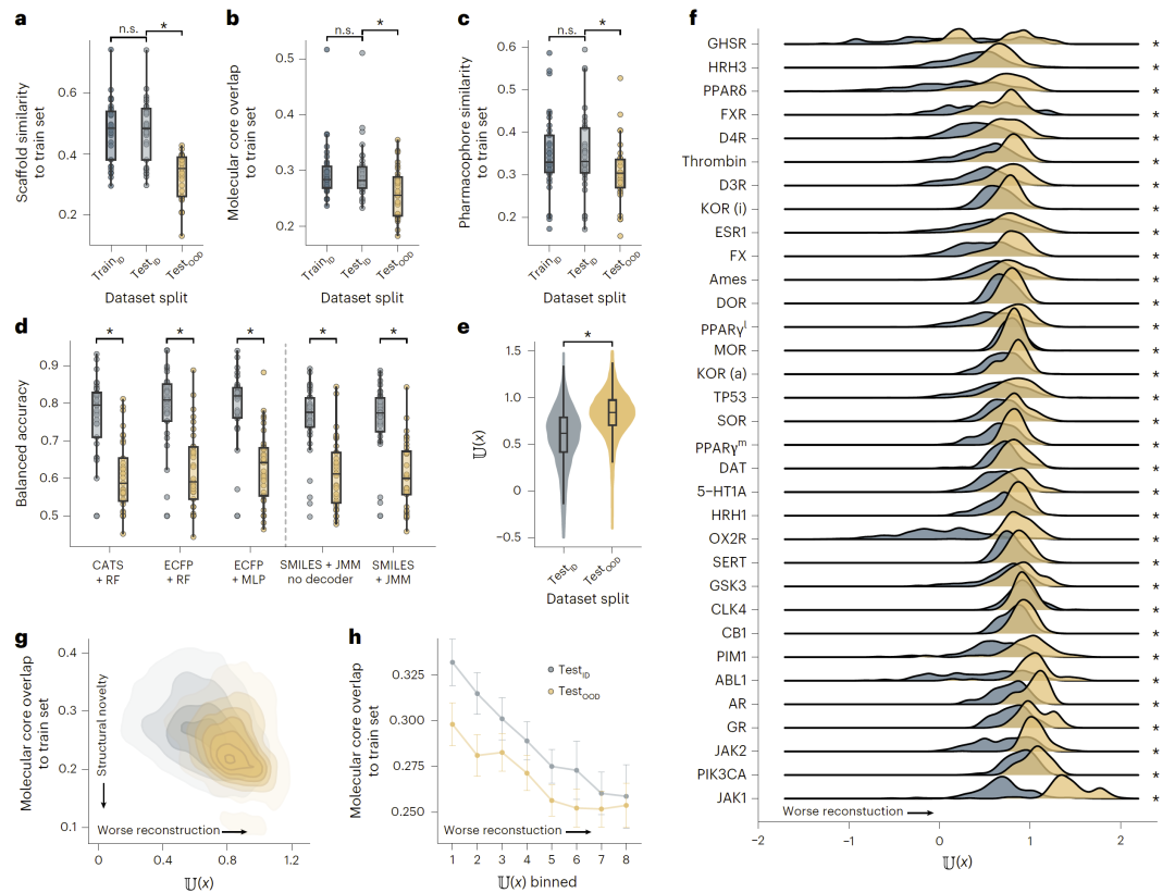 研究人员在33个数据集上系统评估了模型表现。结果表明,分布外分子的不熟悉度显著高于分布内分子,并且这种差异在统计上显著。