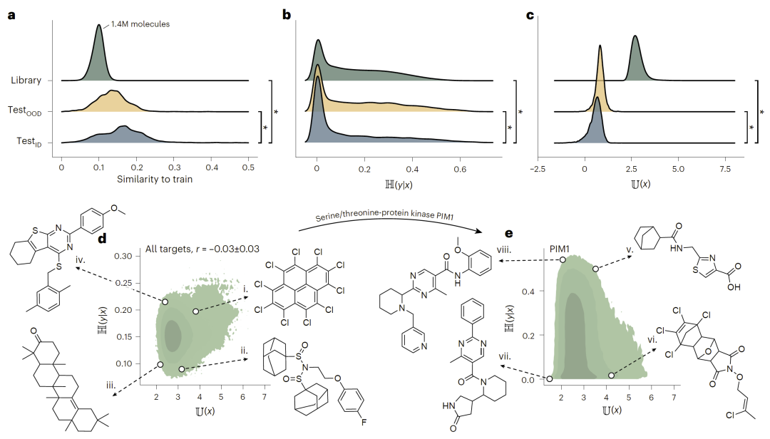 在包含百万级分子的商业库中,不熟悉度成功识别出显著的分布偏移,而不确定性指标未能检测到这种差异。