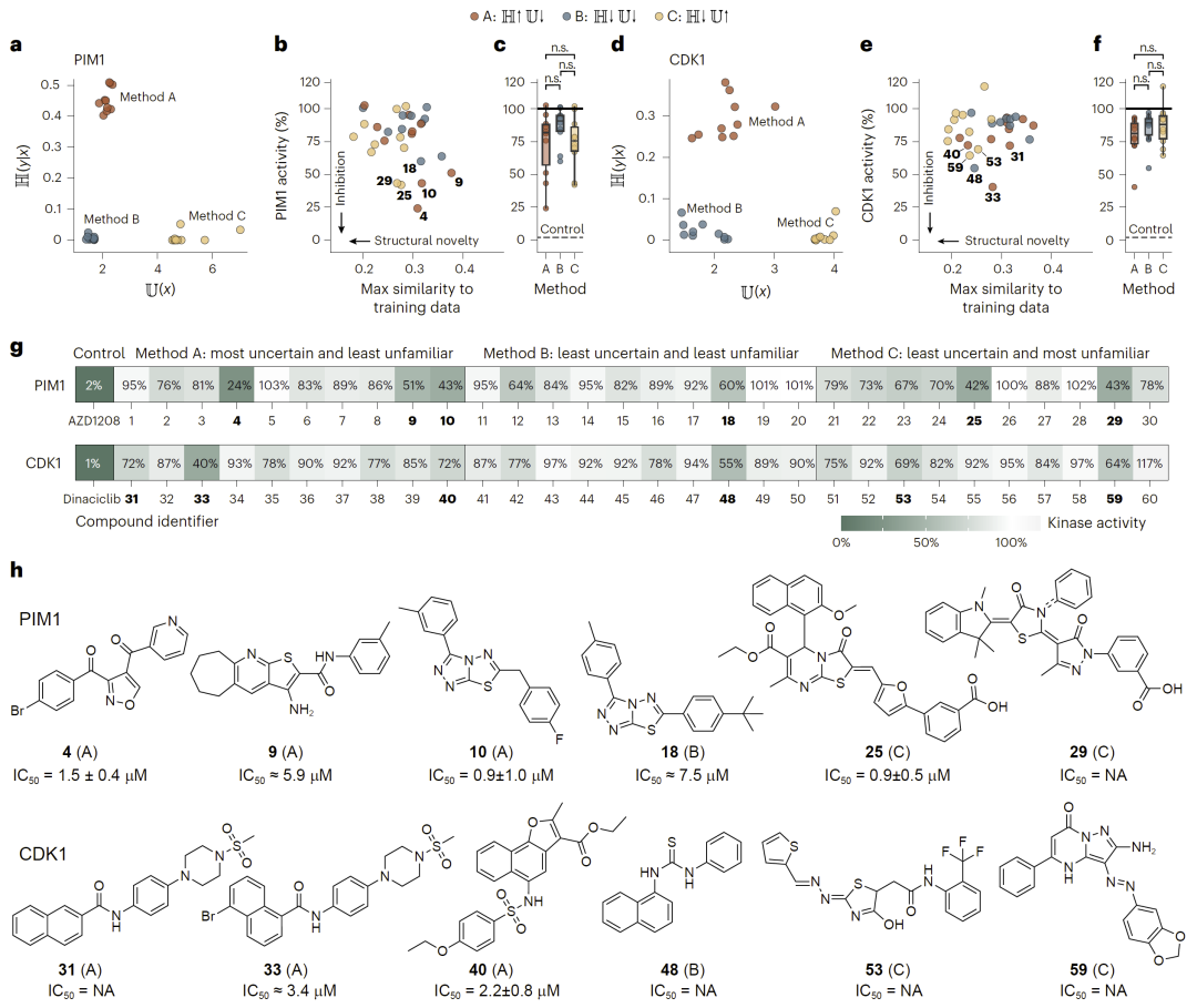 研究人员在两个激酶靶点(PIM1和CDK1)上进行了真实筛选实验。通过结合预测活性、不确定性和不熟悉度三个指标,筛选候选分子。