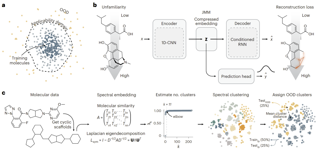 分子机器学习模型通常难以泛化到训练数据之外的化学空间,这限制了其在结构新颖分子上的预测能力。为了解决这一问题,研究人员提出了一种联合建模方法,将分子性质预测与分子重构任务结合,从而引入一种新的指标——“不熟悉度”(unfamiliarity),用于评估模型的泛化能力。