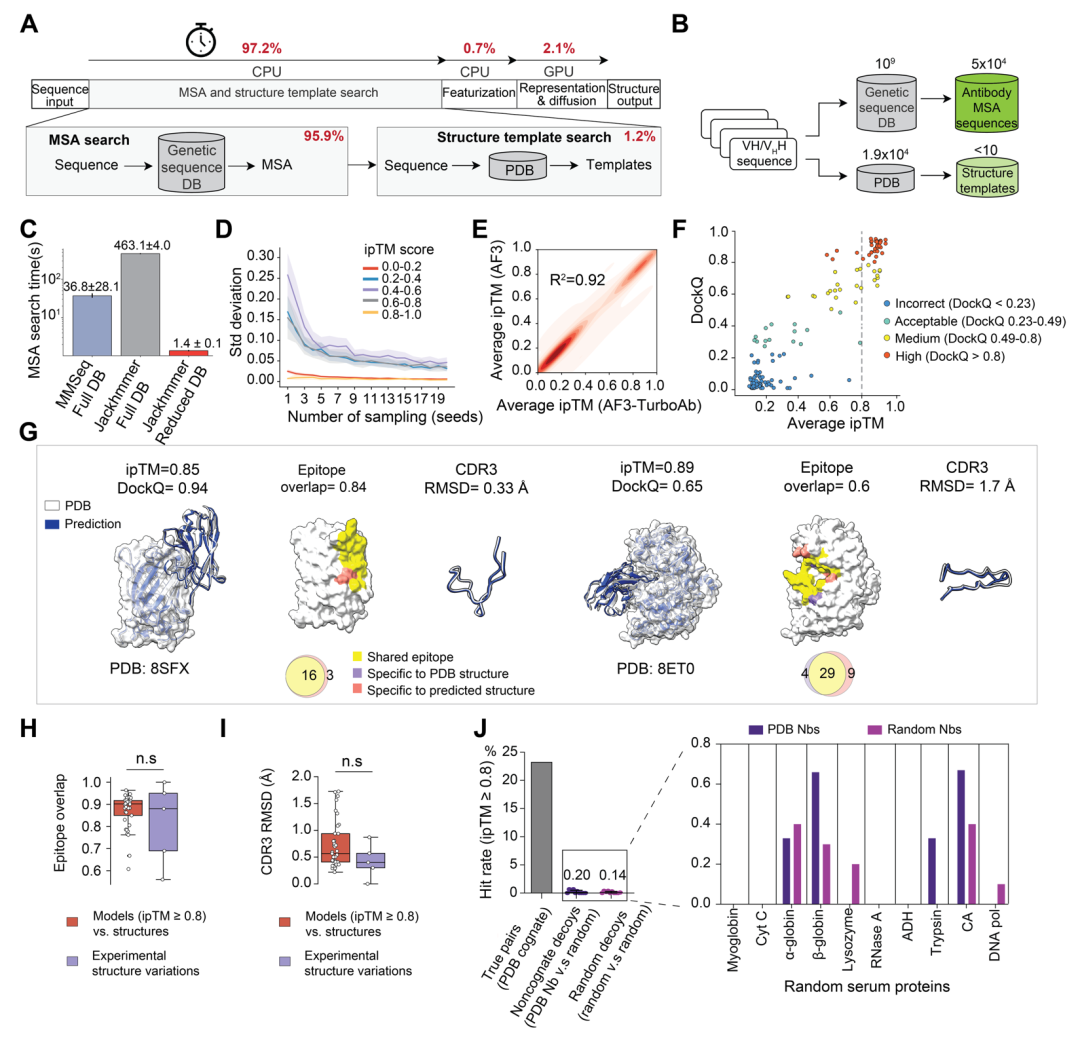 抗体药物已成为现代医学的重要支柱,但要真正看清一个抗体如何识别靶标,往往需要高分辨率复合物结构。长期以来,这一步主要依赖X射线晶体学和冷冻电镜,周期长、成本高、通量有限,难以支撑大规模抗体发现与表位导向设计。近日,纽约西奈山医学院时毅团队联合凯斯西储大学研究团队开发出AF3-TurboAb。该研究由桑哲、向宇菲为共同第一作者。AF3-TurboAb基于AlphaFold3优化而来,可在单张 GPU 上实现库规模抗体-抗原复合物的高通量结构预测。该平台不仅适用于纳米抗体,也适用于全长 IgG 抗体,显示出较好的通用性。更重要的是,这一平台不仅显著提速,还通过系统 benchmark 和实验验证,证明其预测结果具有很高可靠性。