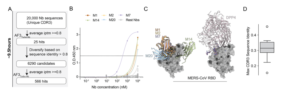 在 MERS-CoV RBD 概念验证中,团队对 20,000 条候选纳米抗体序列完成端到端虚拟筛选,整个流程仅用时 9.5 小时。最终合成的候选中,5/19 展现出特异性 ELISA 结合活性,显示出 AF3-TurboAb 在公共卫生应急场景中的应用潜力。
