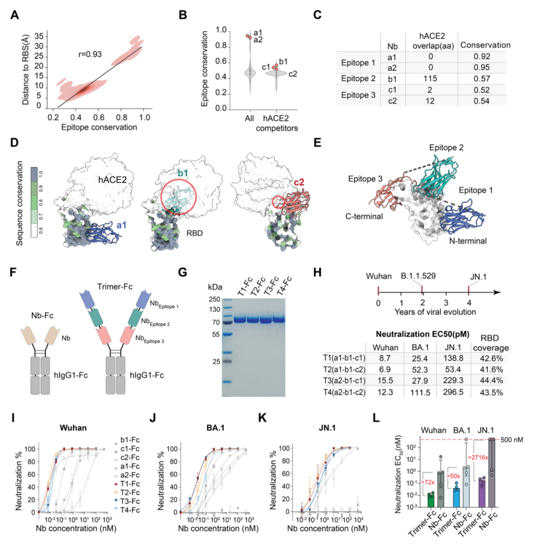 团队利用表位图谱理性组合多个互补表位,设计了三表位 SARS-CoV-2 中和构建体。构建后的 Trimer-Fc 在 Wuhan、BA.1、JN.1 等主要变异株中均保持强效中和,其中对 JN.1 的中和 EC50 相比单价对照最高改善超过 2,716 倍。这表明,库规模结构图谱可以直接指导更不易发生病毒逃逸的多表位抗体设计。