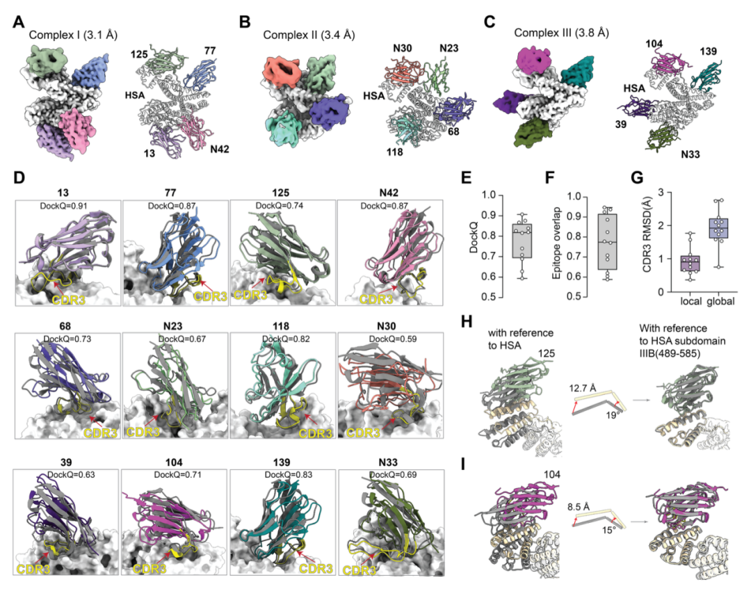 为了严格检验模型性能,研究团队基于预测结果预先挑选了 12 个识别不同表位的人血清白蛋白纳米抗体,并解析了全部 12 个复合物的冷冻电镜结构,分辨率为 3.1 到 3.8 Å。结果显示,所有表位均被正确识别,其中 10 个复合物与预测结果高度吻合,DockQ 为 0.59 到 0.91。即使面对超长 CDR3 环,模型依然表现稳定。