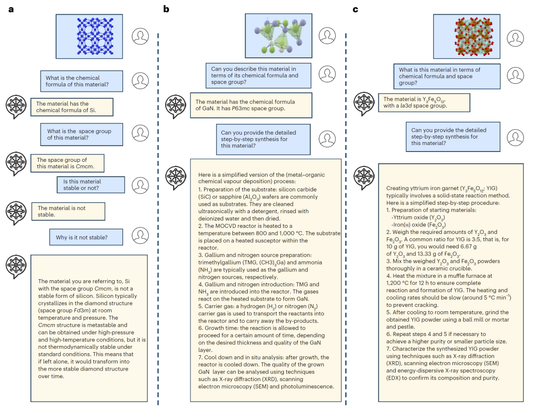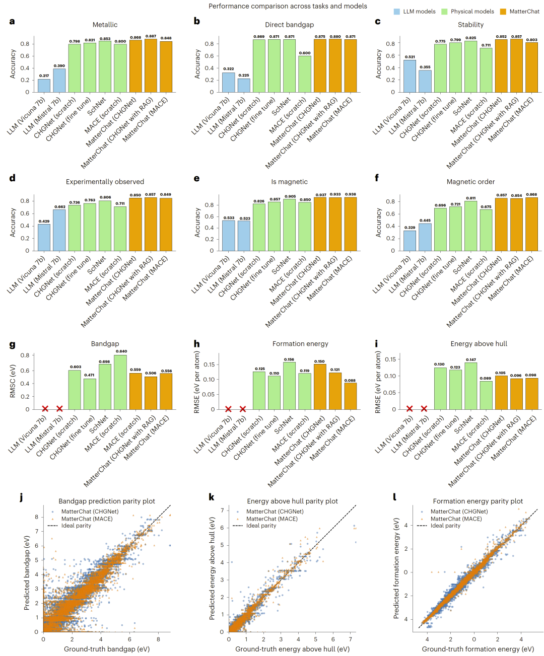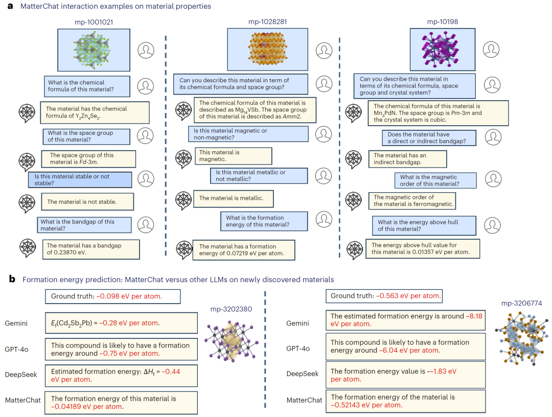 针对这一问题,研究人员提出了MatterChat,一个结构感知的多模态大语言模型框架。该模型通过一个桥接模块,将预训练的原子间相互作用模型与大语言模型进行对齐,从而实现结构数据与文本信息的统一建模。实验结果表明,MatterChat在材料性质预测与人机交互任务中显著优于通用大模型,同时能够支持复杂科学推理与材料合成过程的逐步生成。这一方法为材料科学中的智能辅助设计与发现提供了新的范式。