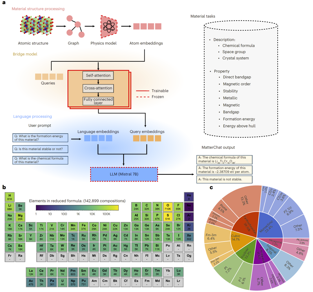 MatterChat由材料分支、语言分支和桥接模块组成,形成一个统一的多模态框架。数据集包含约14万种材料结构,覆盖周期表中广泛元素,并具有丰富的晶体结构分布。