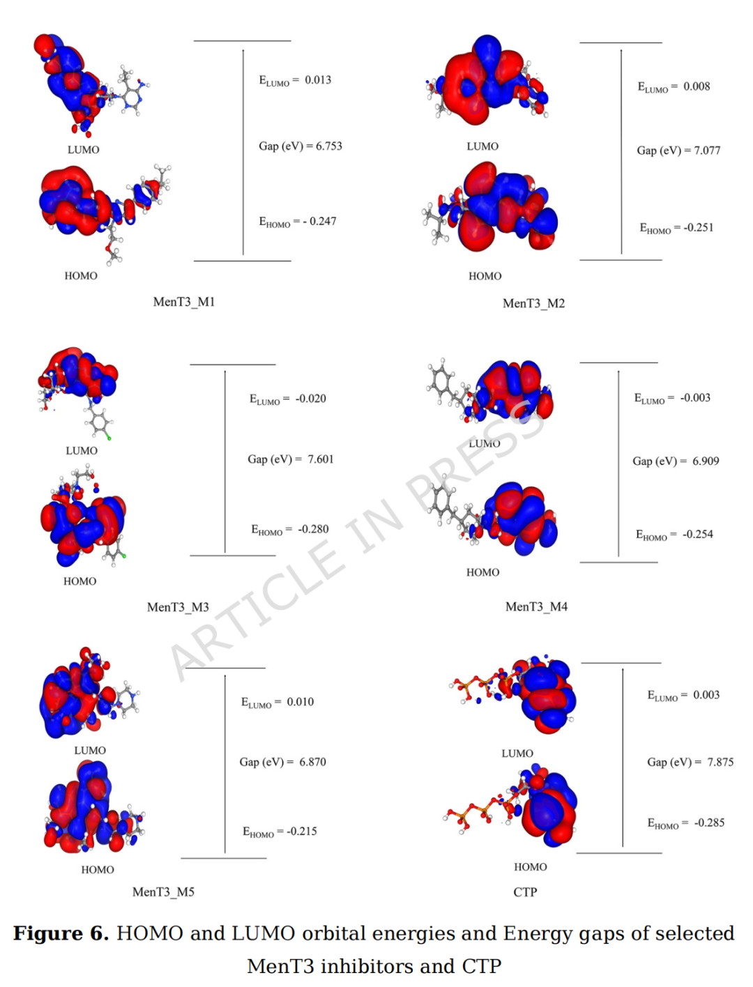 五个候选分子的HOMO-LUMO能隙均在6.75~7.60 eV之间,与CTP(7.875 eV)高度可比。大于6 eV的能隙表明这些分子具有足够的化学稳定性,同时保持适度的反应活性以与靶蛋白形成持续相互作用。