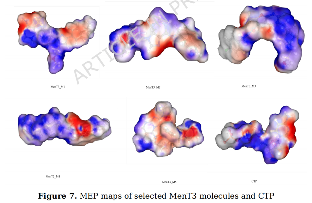 MenT3_M3在电离势、正电子亲和能、电负性和亲电指数上均与CTP最为接近,展示出最强的电荷转移参与能力。MenT3_M5软度最高(8.868 Hartree⁻¹),化学反应性最强但稳定性相对较弱。