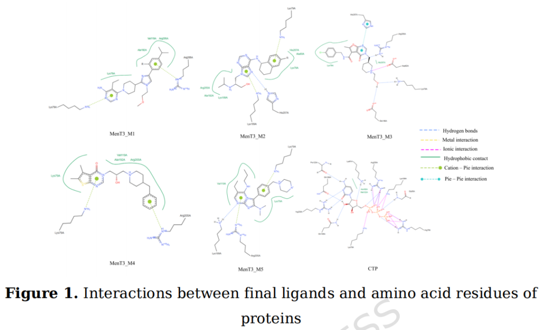 关键发现: 所有候选分子均与Val119形成疏水接触(与CTP一致),且与Lys61、Arg205的氢键相互作用高度保守,提示它们占据相同的活性位点。MenT3_M3额外形成Asp82-Glu146盐桥,可能赋予更强的静电稳定性。