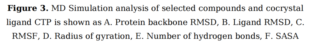 进一步要求候选分子含有吡嗪环(pyrimidine ring)骨架(与CTP中胞嘧啶核心一致,有利于类似的氢键网络形成),最终确定14个候选分子进入动力学模拟。