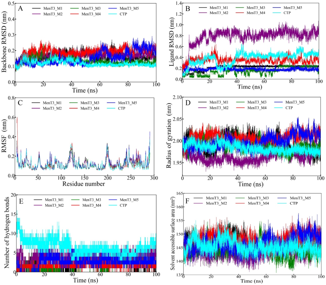 所有复合物蛋白骨架RMSD均维持在合理范围,表明候选分子未引起MenT3构象的显著扰动,与CTP行为高度相似。