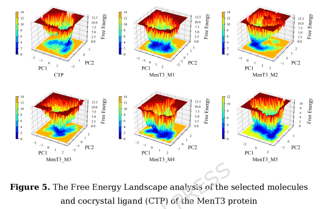 核心结论:MenT3_M2、MenT3_M4、MenT3_M5三个分子的结合自由能均优于天然底物CTP,尤其MenT3_M2以-46.71 kcal/mol展示出最强结合亲和力。值得注意的是CTP自身的标准差(24.40)较大,而MenT3_M5的标准差最小(2.34),表现出最高的结合一致性。