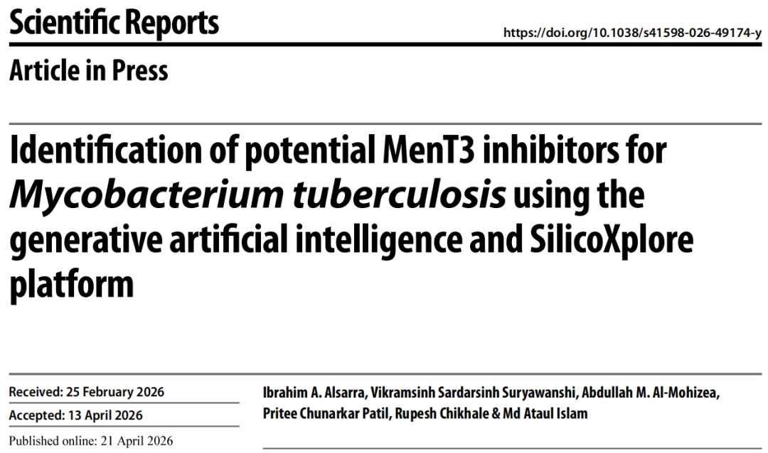 标题: Identification of potential MenT3 inhibitors for Mycobacterium tuberculosis using the generative artificial intelligence and SilicoXplore platform 作者: Ibrahim A. Alsarra, Vikramsinh Sardarsinh Suryawanshi, Abdullah M. Al-Mohizea, Pritee Chunarkar Patil, Rupesh Chikhale, Md Ataul Islam 期刊:Scientific Reports DOI:10.1038/s41598-026-49174-y