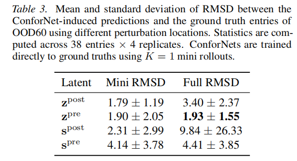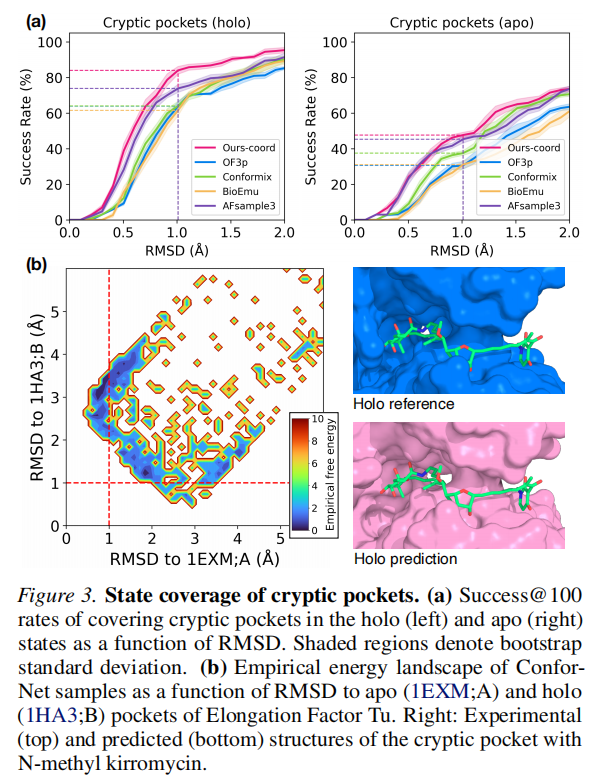 模板引导的失败:将 centroid 蛋白质的期望构象作为模板提供给 OF3p 并不能改善结果,甚至略有下降。这表明 ConforNets 的成功并非简单地源于提供了结构信息,而是真正改变了潜在空间的偏好。