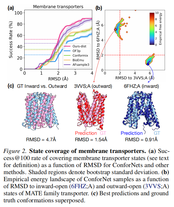 ConforNets 的经验性自由能景观(从样本密度计算)在 MATE 转运蛋白案例中显示出清晰的双态漏斗,但这只是观察性的,并不代表热力学上正确的玻尔兹曼权重。无法用于获得系综平均可观测量。
