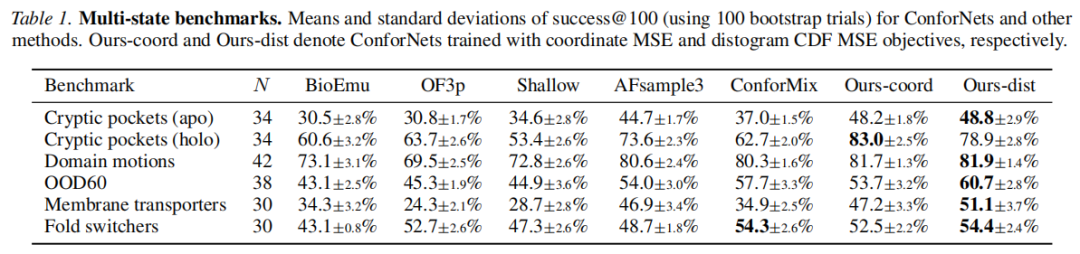 表:success@100 多构象基准对比(均值 ± 标准差)