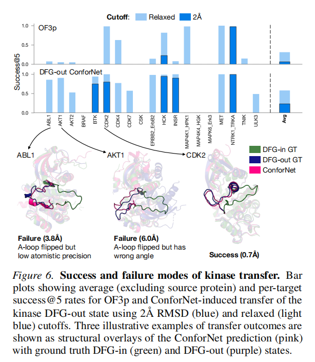 激酶:相对提升最难,success@5 从 5.9% 提升至 22.8%。核心原因在于激酶 A-loop 可发生 ~180° 翻转,RMSD 偏差可达 20Å,精确重建极具挑战性。引入"宽松判据"(预测更接近 DFG-out 且 RMSD < max[2, ½·RMSD(in, out)])后,ConforNets 提升从 30%→58%(vs. 默认 OF3p 的 6%→23%)。