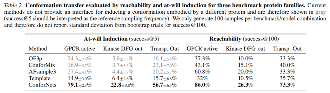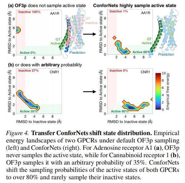 GPCR:ConforNets 将 success@5 从 24.3% 提升至 79.1%(提升 3.3 倍)。对于 Adenosine 受体 A1,默认 OF3p 从未采样到活性态;对于 Cannabinoid 受体 1,OF3p 以 35% 的偶然概率采样到活性态。ConforNets 将两者的活性态采样概率均提升至 80% 以上,并极少采样非活性态。