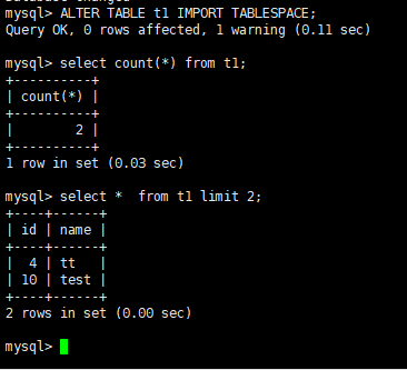 4. 执行IMPORT TABLESPACE,重建表与表空间、数据字典的关联