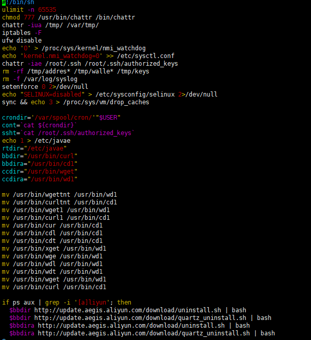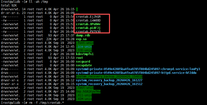 近期我的阿里云MySQL生产服务器遭遇恶意入侵,黑客植入持久化定时木马,通过文件特殊属性锁定、系统命令权限篡改、安全软件强制卸载、防火墙封禁等多重手段,锁住Crontab等目录、禁止权限修改、拦截解锁命令,常规清理操作全部失效。