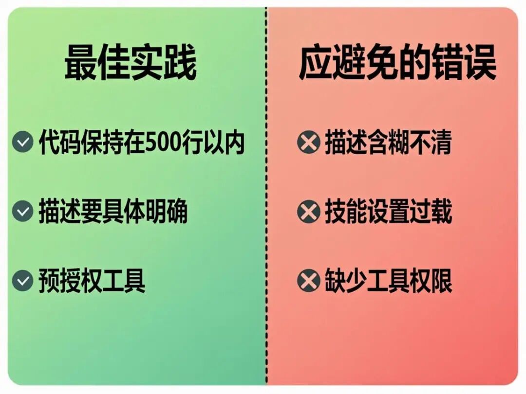 SKILL.md 控制在 500 行以内 | 过长会被截断,核心指令丢失 |