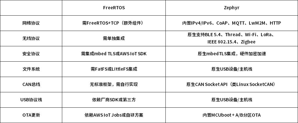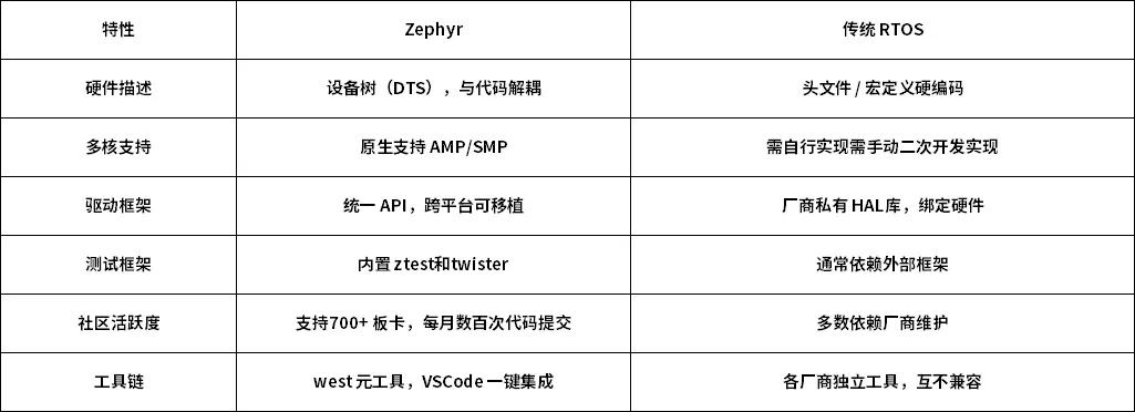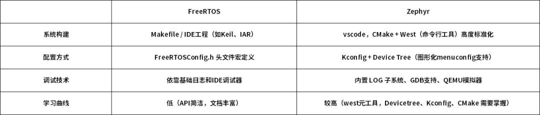 从对比能看出,Zephyr的短板主要集中在入门阶段和极致资源受限场景,一旦团队熟悉开发流程、硬件资源满足要求,这些劣势会快速弱化;而它的可移植性、安全能力、生态优势,会随着项目复杂度提升愈发明显。