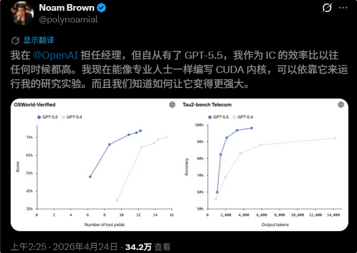 OpenAI 的 Noam Brown 说,自己明明是 manager,但用了 GPT-5.5 以后,比过去任何时候都更像一个有效 IC。(我现在写CUDA内核像专业人士一样,还能靠它跑研究实验。)IC指Individual Contributor,即一线动手干活的角色,他作为经理却觉得自己在技术产出上达到了新高峰。