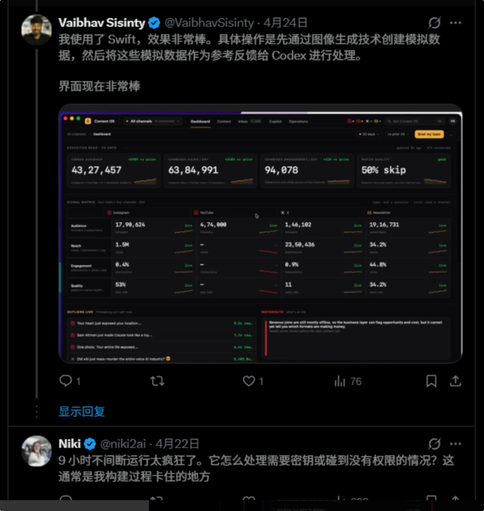 还有一个做真实业务的人很谨慎地说,别信那些空泛 hype,但她确实让 Codex + GPT-5.5 跑过接近 6 小时,做迁移前 edge case synthetic data 工具,而且结果能用。