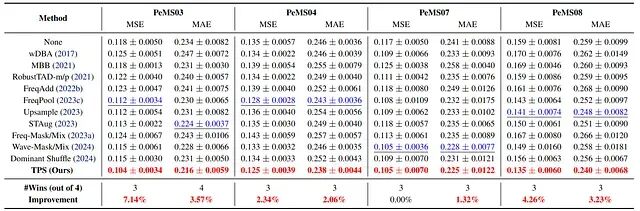 TPS 随后在四个短期交通数据集(PeMS-03、04、07、08)上用 PatchTST 再做一轮评估,仍然拿到了整体最强的增强表现 。