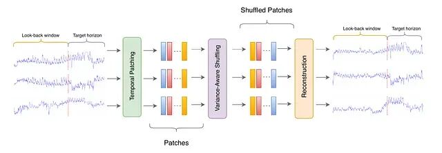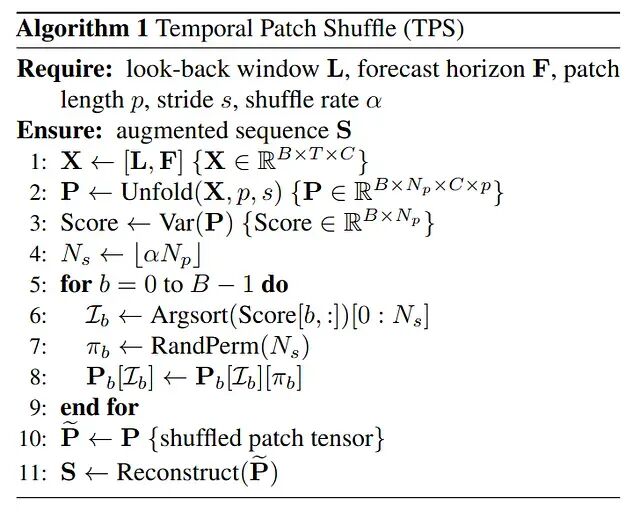 TPS核心流程不复杂:给定完整序列(look-back 窗口与预测 horizon 的拼接),先提取重叠的时间 patch,为每个 patch 算一个基于 variance 的分数,按这个分数选择性地 shuffle 一个 patch 子集——低 variance 的优先——最后在重叠区域取平均来重建整条序列。