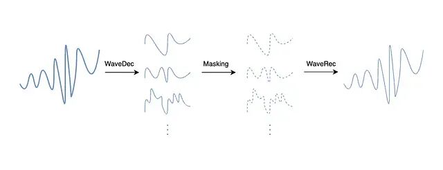 图 4. WaveMask 流水线:信号先经 DWT 分解,wavelet 系数在每一层被选择性 mask,再经逆 DWT 重建。