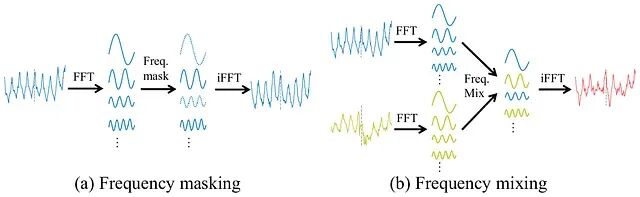 图 2. FreqMask 移除选定的频率分量;FreqMix 在两个序列之间混合频率。