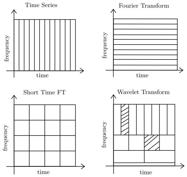 图 3. 时频分辨率比较。Fourier Transform 无时间定位;STFT 使用固定大小的窗口;Wavelet Transform 在不同尺度上自适应调整分辨率。
