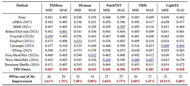 TPS 在九个长期预测数据集上进行评估,用到五个近期的骨干:TSMixer、DLinear、PatchTST、TiDE、LightTS。在所有骨干上,TPS 都拿到了所比较增强方法中最好的平均 MSE。下图给出了整体比较。