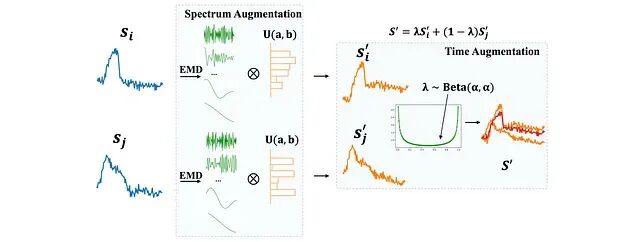 STAug 属于基于分解的一类。它对两个序列施加 Empirical Mode Decomposition (EMD),得到 intrinsic mode functions (IMFs),再用从均匀分布采样的 mixup 式插值权重把两组 IMF 重新组合。产出的是一段混合了两个输入时间特征的新序列。