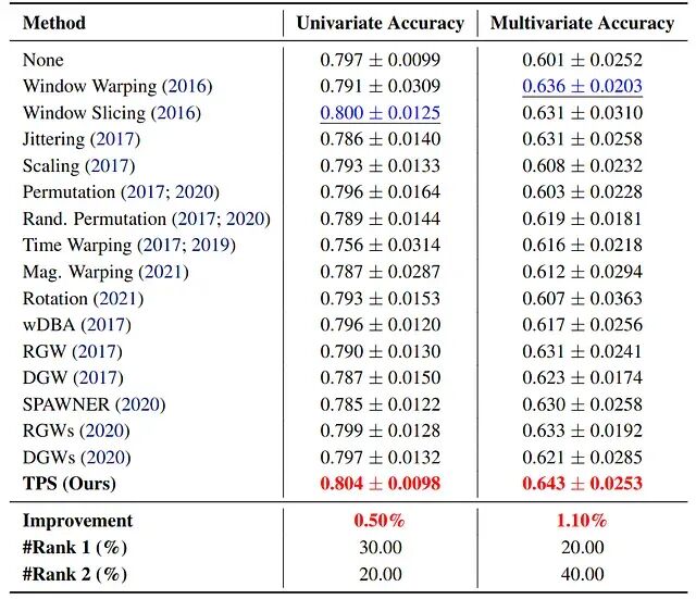 TPS 还有一个讨喜的地方,就是迁到分类任务上的顺滑程度。分类任务没有预测 horizon,只需要两处改动:直接作用在输入序列 (X) 上(不再做拼接),并把 shuffle 从批次级别移到样本级别。就这点改动,TPS 在单变量(UCR)和多变量(UEA)基准上都拿到了所比较增强方法里最好的平均准确率 。