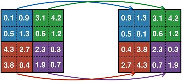 图 8. 计算机视觉中的 PatchShuffle:一张 4×4 图像被划分为非重叠的 2×2 patch,每个 patch 内部的像素被独立 shuffle。