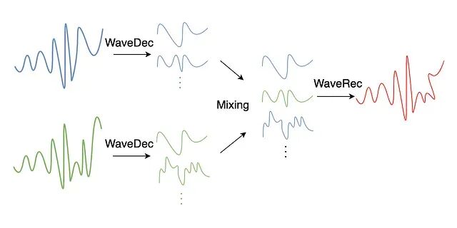 图 5. WaveMix 流水线:两个信号分别分解,它们的 wavelet 系数通过互补 mask 交换,混合后的系数再被重建。