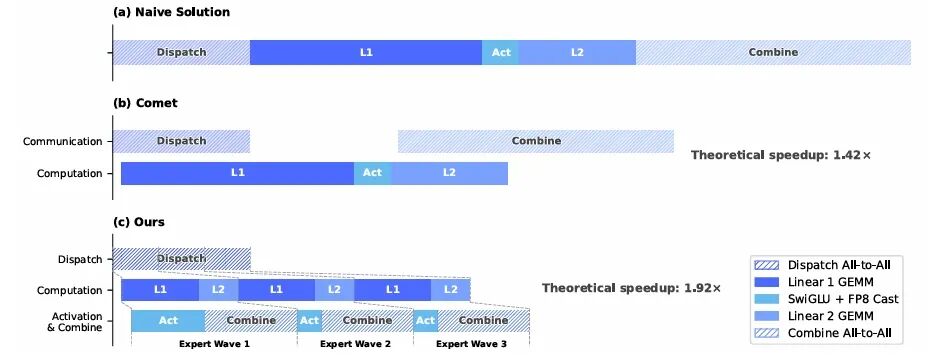 MoE 的瓶颈是 EP(Expert Parallelism)的跨节点 all-to-all。V4 提出按 expert wave 分批调度:把 experts 切成多个 wave,每个 wave 完成通信后立即开始计算;当前 wave 计算、下一个 wave 通信、已完成 wave 的结果回传——三件事并发;整套逻辑融进一个 CUDA mega-kernel(已开源到 DeepGEMM)。