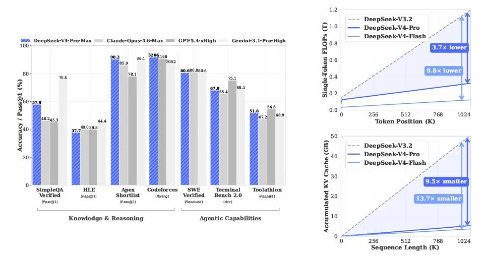 1M token 上下文设置下,DeepSeek-V4-Pro 的单 token 推理 FLOPs 仅为 DeepSeek-V3.2 的 27%,KV Cache 仅为 V3.2 的 10%;V4-Flash 更激进——FLOPs 10%、KV Cache 7%。百万上下文从演示用 demo,变成了可以日常跑的工作负载。